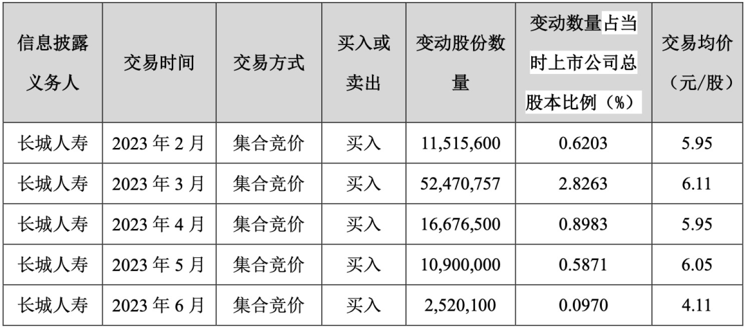 此次增持后,長城人壽共持有公司股份1.12億股,占公司總股本的5.00001%。