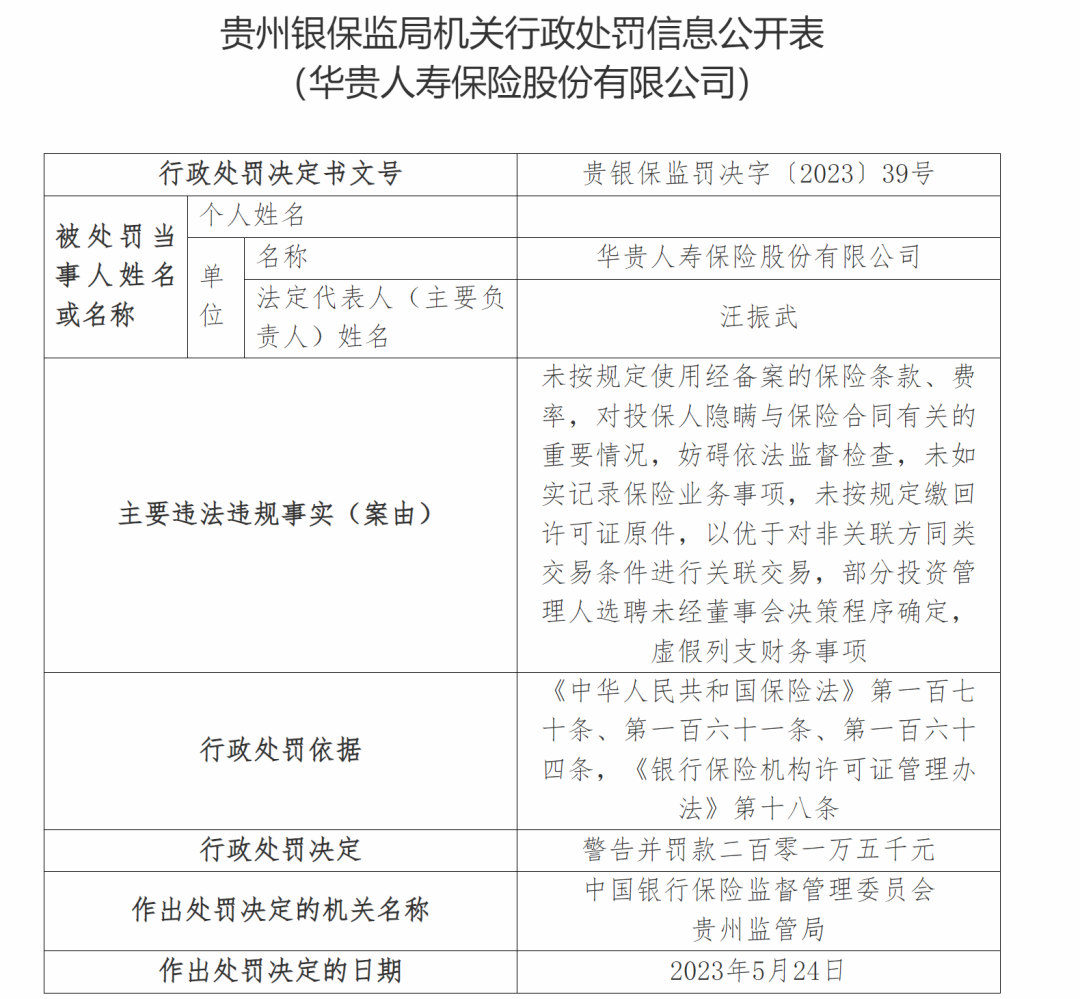公告顯示,2019年1月至2021年8月期間,因華貴人壽存在未按相關(guān)監(jiān)管法律法規(guī)使用經(jīng)備案的保險條款費率、未如實記錄保險業(yè)務(wù)事項等行為,該公司貴州分公司存在未如實記錄保險業(yè)務(wù)事項、未取得任職資格的人員實際履行高管職務(wù)等行為,貴州銀保監(jiān)局對該公司予以警告并罰款201.5萬元,對相關(guān)責任人予以警告并罰款共計67萬元;對該公司貴州分公司予以罰款72萬元,對相關(guān)責任人予以警告并罰款共計9萬元,撤銷任職資格1人。