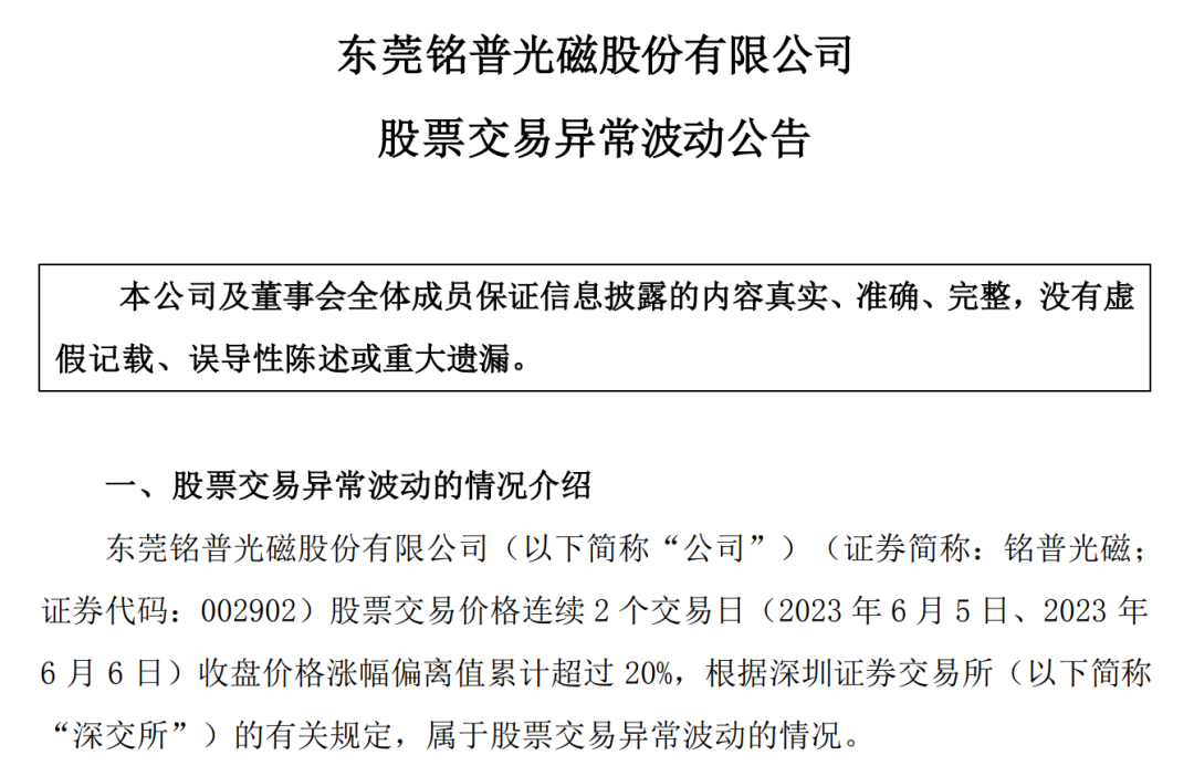 6月6日晚,銘普光磁曾發(fā)布股票交易異常波動公告稱,公司未發(fā)現(xiàn)近期公共傳媒報道了可能或已經(jīng)對公司股票交易價格產(chǎn)生較大影響的未公開重大信息;公司已披露的經(jīng)營情況、內(nèi)外部經(jīng)營環(huán)境未發(fā)生重大變化;公司、控股股東和實際控制人不存在關于公司的應披露而未披露的重大事項。