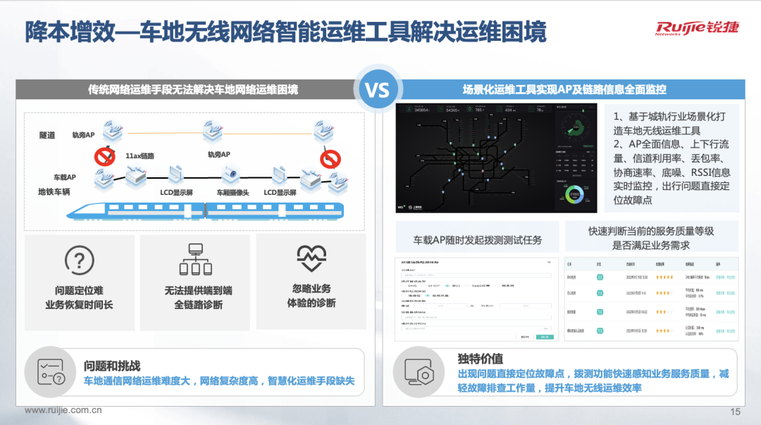 隨著PIS視頻及CCTV視頻的高清化趨勢,車地?zé)o線轉(zhuǎn)儲新應(yīng)用要求提供更高的車地帶寬。同時(shí)在應(yīng)用中,還發(fā)現(xiàn)車地?zé)o線安裝部署慢,車地?zé)o線出問題故障定位難,運(yùn)維效率低等問題。銳捷為解決以上需求全新推出城軌高速車地?zé)o線解決方案,具有高帶寬、新業(yè)務(wù)承載無憂;穩(wěn)切換、視頻流暢不中斷;快安裝、線路施工進(jìn)度快;可視化、設(shè)備運(yùn)維成本低的價(jià)值。