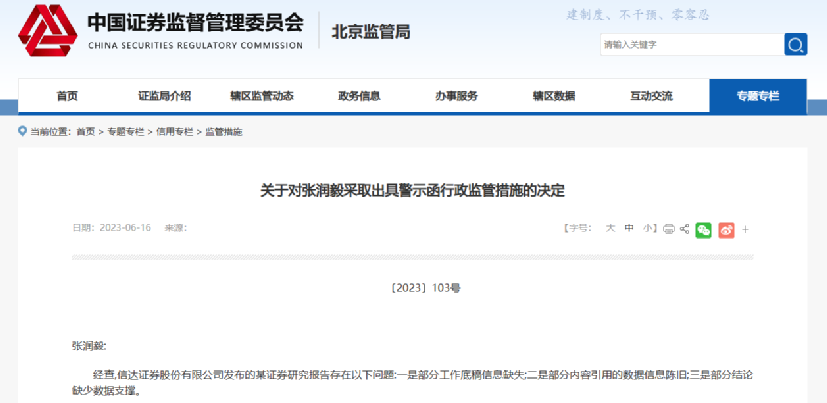 根據(jù)《發(fā)布證券研究報(bào)告暫行規(guī)定》,制作證券研究報(bào)告應(yīng)當(dāng)合規(guī)、客觀、專業(yè)、審慎。署名的證券分析師應(yīng)當(dāng)對(duì)證券研究報(bào)告的內(nèi)容和觀點(diǎn)負(fù)責(zé),保證信息來(lái)源合法合規(guī),研究方法專業(yè)審慎,分析結(jié)論具有合理依據(jù)?;诖?,北京證監(jiān)局決定對(duì)張潤(rùn)毅采取出具警示函的行政監(jiān)管措施。