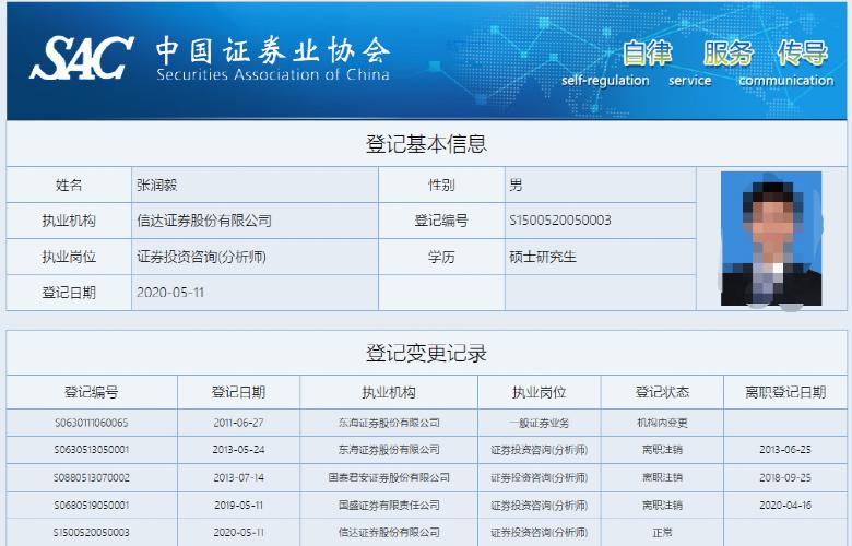 中證協(xié)信息顯示,張潤(rùn)毅曾在東海證券、國(guó)泰君安、國(guó)盛證券等券商從事研究業(yè)務(wù),其中2013年至2018年在國(guó)泰君安研究所工作,工作時(shí)間最長(zhǎng)。2020年5月加入信達(dá)證券,任職至今。