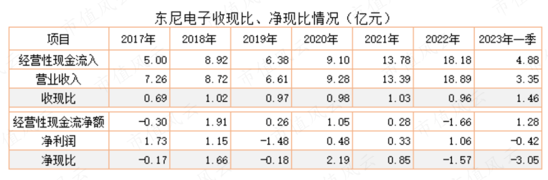 東尼電子收現(xiàn)比正常,該數(shù)值在1上下,而凈現(xiàn)比變動非常大,2022年經(jīng)營性現(xiàn)金流凈額-1.66億元,當(dāng)期雖然有1.06億元的凈利潤,但實際并沒有真金白銀流回上市公司的口袋,賺了個寂寞。