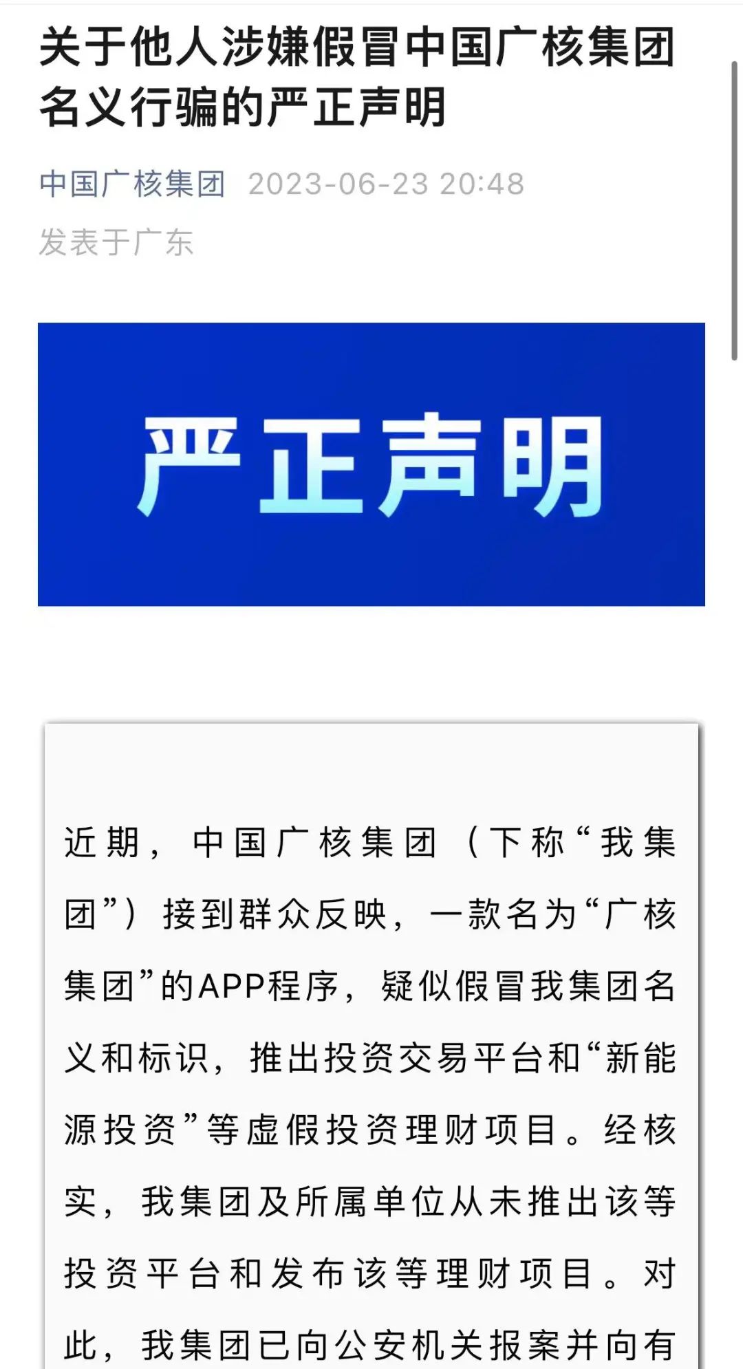 假冒中國(guó)廣核集團(tuán)名義行騙的嚴(yán)正聲明