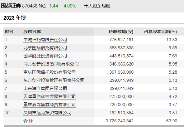 國都證券2023年年報顯示,其第一大股東為中誠信托,持股比例為13.33%。中誠信托第二大股東國家能源集團(tuán)資本控股有限公司,與國華能源投資有限公司同為國家能源投資集團(tuán)的全資子公司。