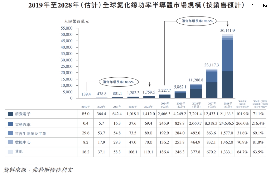 在招股說明書中,英諾賽科委托弗若斯特沙利文對(duì)氮化鎵未來的市場(chǎng)空間進(jìn)行了測(cè)算,其指出,氮化鎵功率半導(dǎo)體的市場(chǎng)規(guī)模將會(huì)從2023年的17.6億元增長(zhǎng)27倍至2028年的501.42億元,2023-2028的復(fù)合增長(zhǎng)率達(dá)到95%,從市場(chǎng)滲透率的角度看,氮化鎵在整個(gè)功率半導(dǎo)體行業(yè)中的滲透率將會(huì)從2023年的0.5%提升至2028年的10.1%。