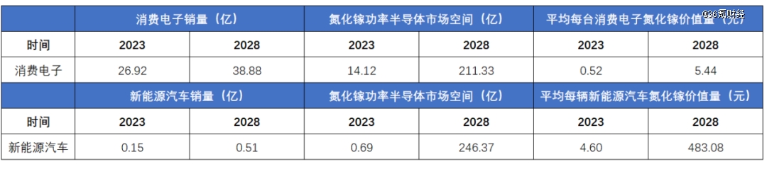 具體來看,消費(fèi)電子和電動(dòng)汽車行業(yè)將會(huì)貢獻(xiàn)主要的增量。其中消費(fèi)電子市場(chǎng)將會(huì)從2023年的14.12億元提升至211.33億元,主要還是氮化鎵充電器驅(qū)動(dòng),電動(dòng)汽車則會(huì)從0.7億元提升至246.36億元。