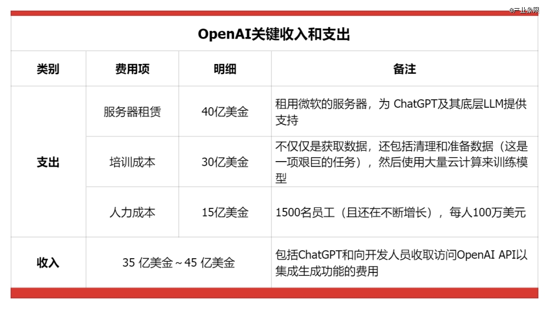 美國科技媒體The Information做過一個(gè)測(cè)算,按照OpenAI的支出,其2024年的費(fèi)用可能高達(dá)85億美元,即算上35億美元的收入,其2024年的虧損也將高達(dá)50億美金。