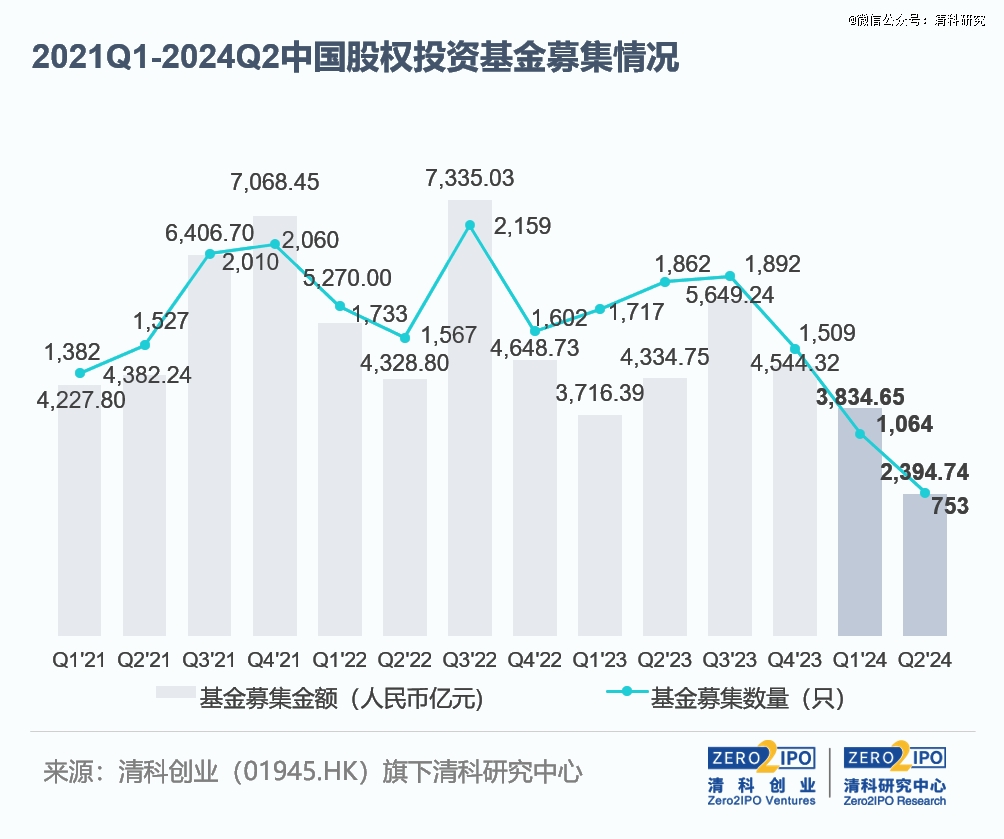 2024年上半年,我國股權(quán)投資市場新募集基金數(shù)量和募資規(guī)模均大幅下降。根據(jù)清科創(chuàng)業(yè)(01945.HK)旗下清科研究中心統(tǒng)計(jì),上半年共1,817只基金完成新一輪募集,數(shù)量同比下降幅度達(dá)到49.2%;募資規(guī)模為6,229.39億元人民幣,同比下跌22.6%。