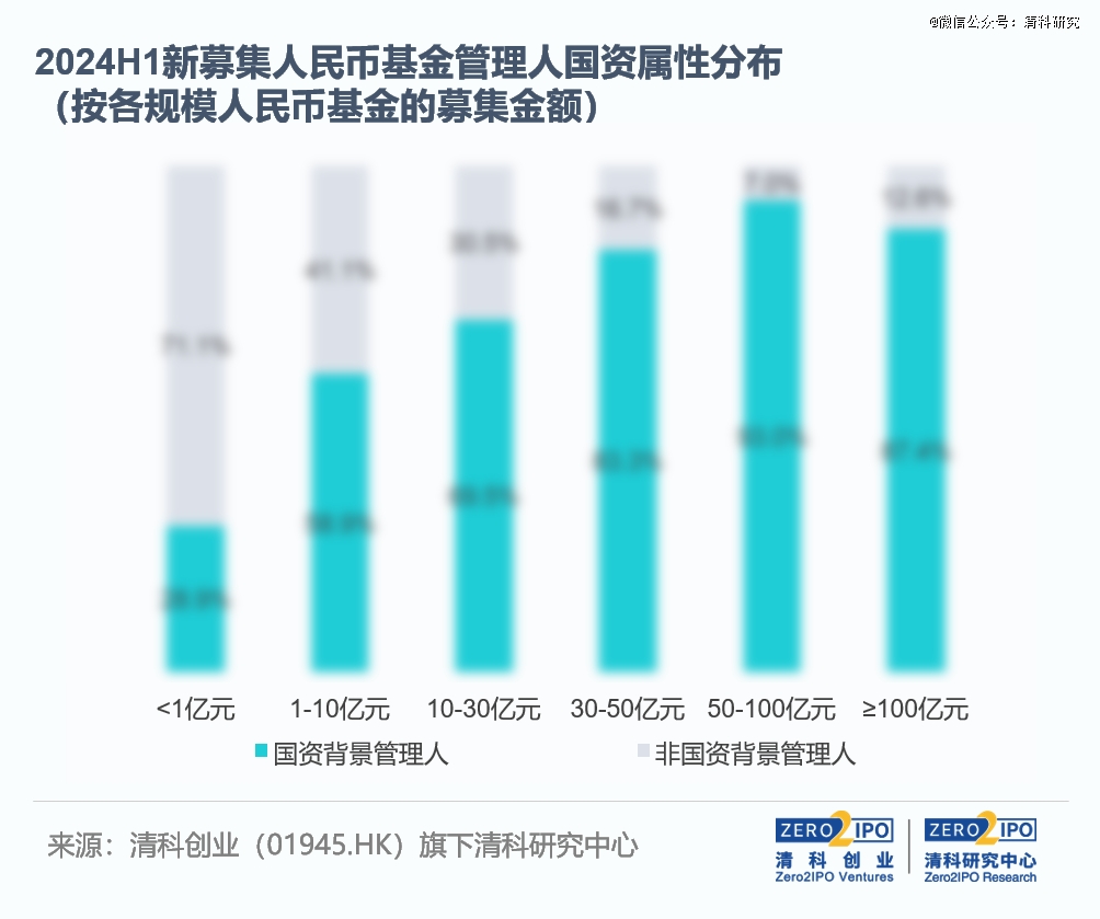 國資背景管理人的募資規(guī)模仍保持優(yōu)勢。除金額不足1億元人民幣的小規(guī)?;鹜?,其余各規(guī)模區(qū)間的新募集人民幣基金中,國資背景管理人所管基金的新募集金額占比均超過五成。上半年新募集金額在30億元及以上的人民幣基金中,這一比例均在80%以上。