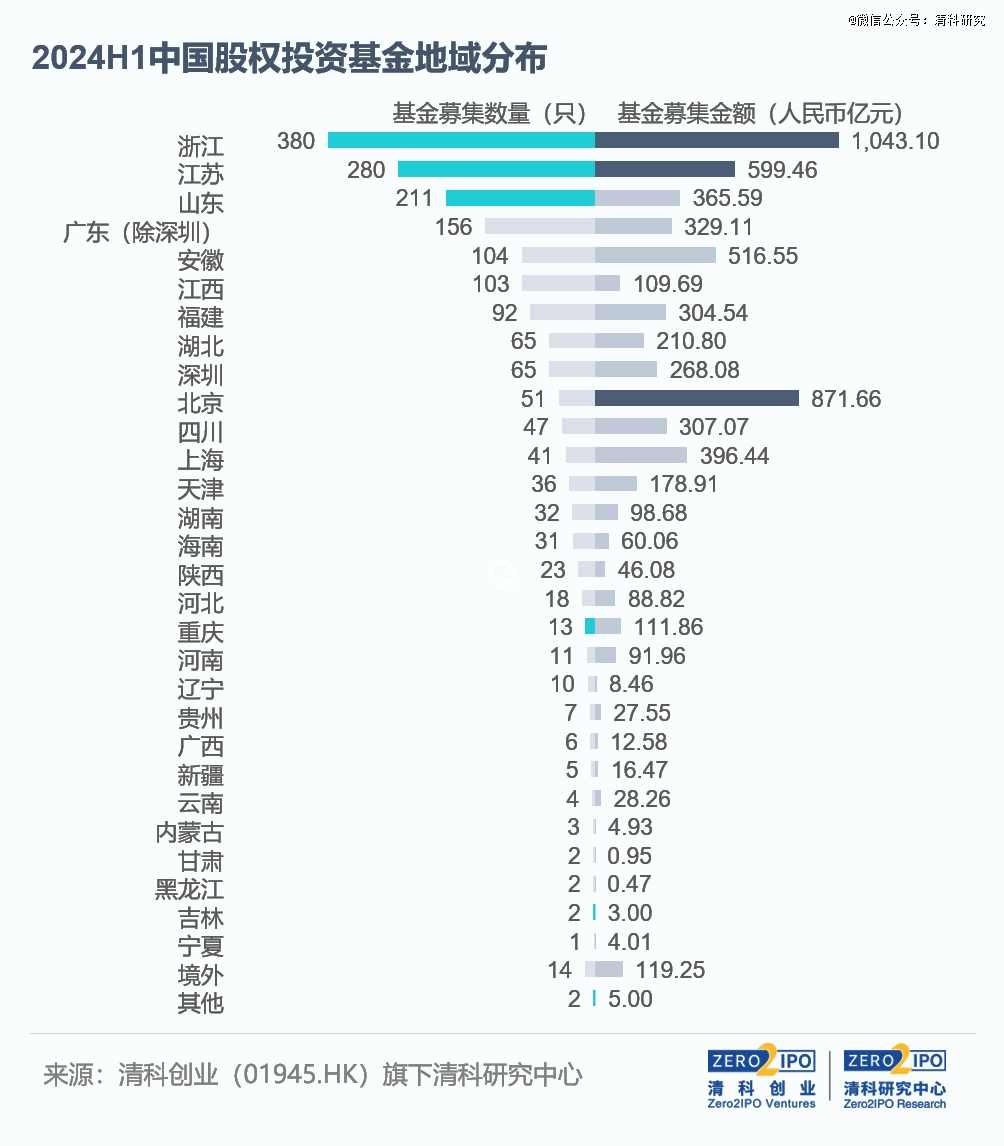 2024年上半年,全國各地的新募基金數(shù)量和募資規(guī)模普遍出現(xiàn)不同程度的下降。但總體來看,浙江、江蘇、山東、廣東等地募資情況仍相對*。其中,浙江上半年新募基金數(shù)量*全國,共380只基金完成新一輪募集,但同比降幅達(dá)49.3%;募資規(guī)模為1,043.10億元人民幣,同比雖下滑12.5%,卻是全國*一個(gè)募資規(guī)模超過千億的地區(qū)。江蘇、山東兩地的新募集基金數(shù)量*于其他地區(qū),基金數(shù)量均超過200只,但同比降幅均在40%以上。2024年上半年,北京共計(jì)51只基金完成新一輪募集,同比小幅提高4.1%。在多只國資背景管理人發(fā)起設(shè)立的大額基金影響下,北京募資規(guī)模達(dá)到871.66億元人民幣,位居全國第二位。