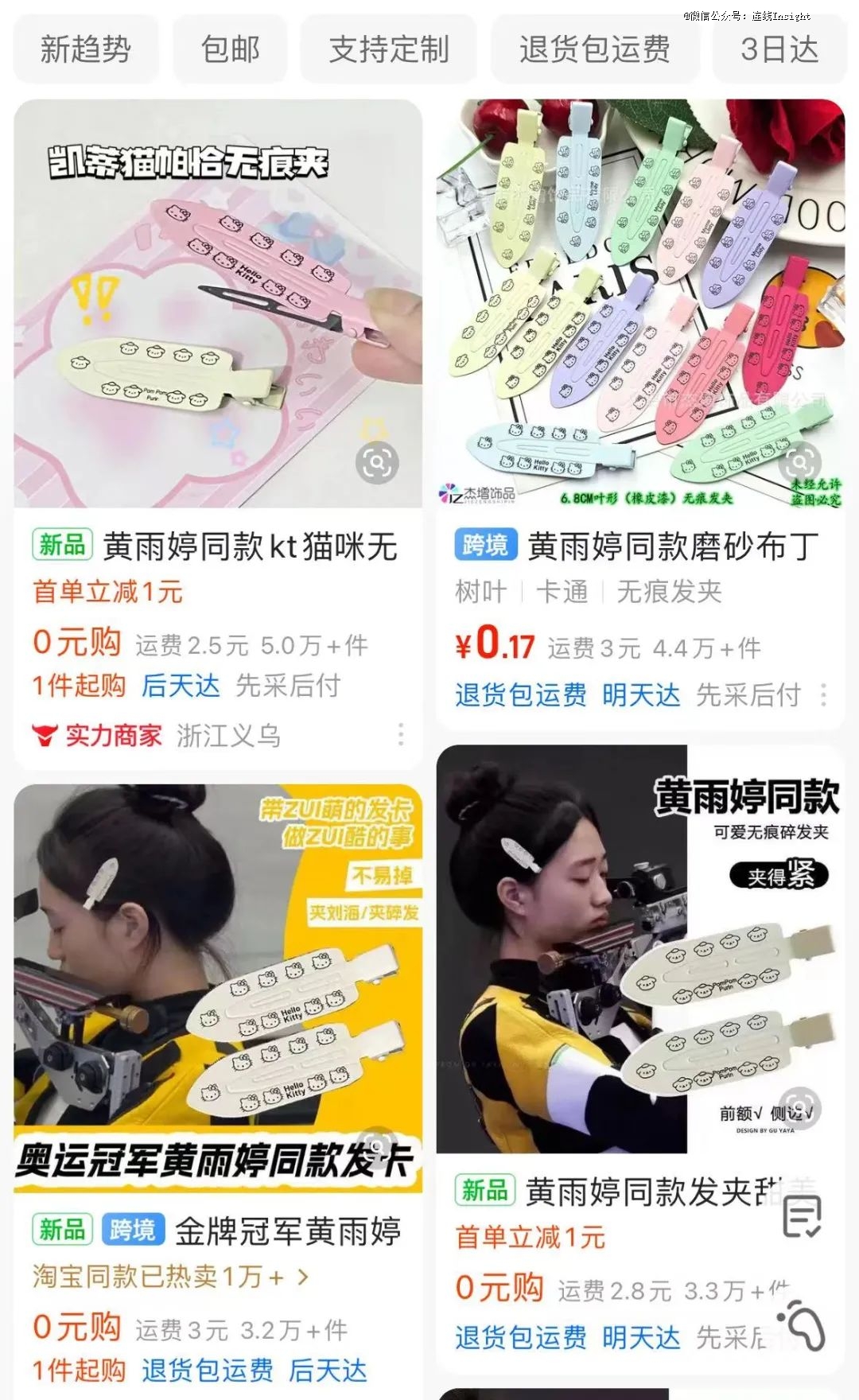 運動員們就是行走的帶貨達人,其佩戴的小配飾也能吸引關(guān)注。全紅嬋的丑魚拖鞋、鄭欽文的同款發(fā)箍;黃玉婷的同款劉海夾、不少運動員佩戴過的沙雕五環(huán)眼鏡等單品爆紅網(wǎng)絡(luò),同款產(chǎn)品在1688、拼多多等平臺上獲得了極高的銷量。