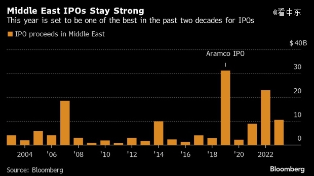 過(guò)去兩年,這個(gè)能源豐富的地區(qū)已成為繁忙的IPO市場(chǎng),因?yàn)楦鲊?guó)政府打算在原油價(jià)格居高不下的情況下出售其國(guó)有企業(yè)的股份,以擺脫對(duì)石油的依賴。盡管融資額低于去年,但 105 億美元的 IPO 收益已經(jīng)創(chuàng)下了第三高的年份。2023年,海灣地區(qū)已經(jīng)占領(lǐng)了歐洲、中東和非洲 IPO 總量的 45%。