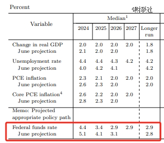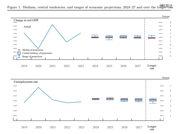 與會者們將2024年美國GDP增長預(yù)期從2.1%下調(diào)至2%,并預(yù)計未來三年的增長都將保持在這一數(shù)字,長期增速保持在1.8%不變;今年的失業(yè)率預(yù)期從4%上調(diào)至4.4%,未來三年分別為4.4%、4.3%和4.2%。