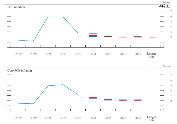 同時,與會者下調(diào)了對今明兩年P(guān)CE(個人消費支出)通脹和核心PCE通脹的預(yù)期,其中PCE通脹率從2.6%(2024年預(yù)期)和2.3%(2025年預(yù)期)下調(diào)至2.3%和2.1%,核心PCE則從2.8%和2.3%下調(diào)至2.6%和2.2%。