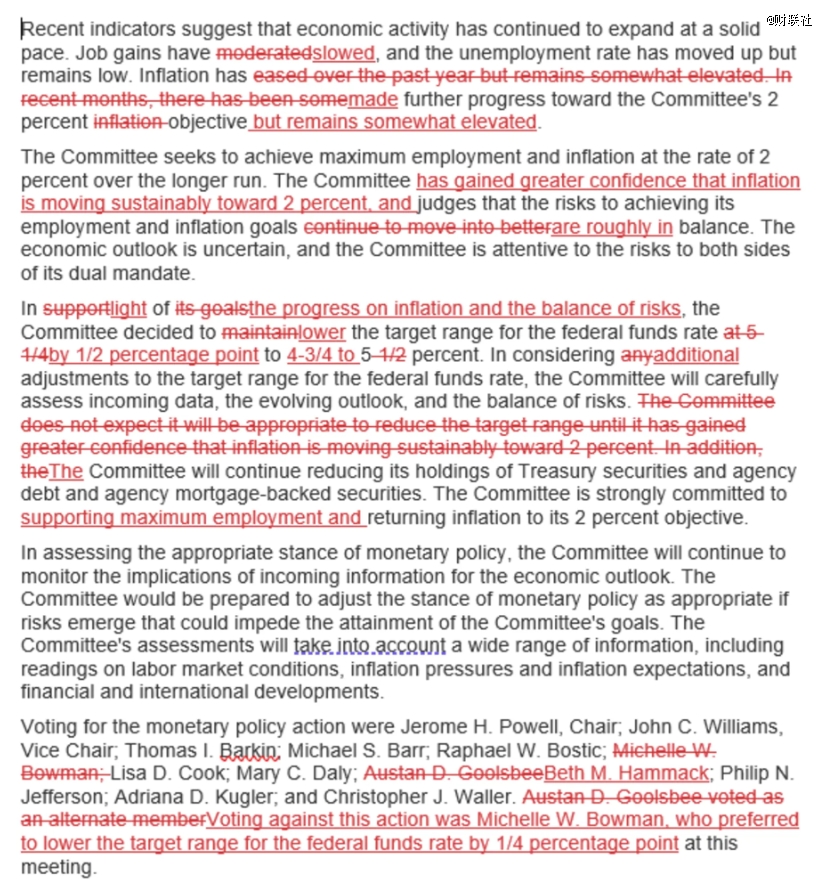 根據(jù)與上一次決議聲明進(jìn)行的比對,F(xiàn)OMC將就業(yè)“穩(wěn)定”改為“放緩”;修改了對于通脹的描述;“進(jìn)入到更好的風(fēng)險平衡”改為“大致平衡”;刪除了“在對通脹持續(xù)向2%邁進(jìn)更有信心之前,不宜降低利率目標(biāo)區(qū)間”的措辭。