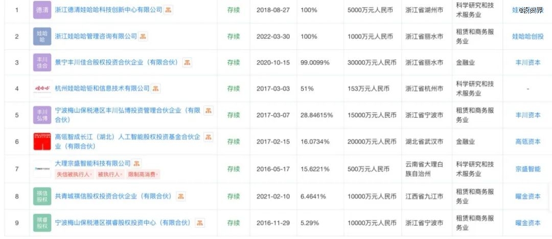 不止于此,宗馥莉本人也涉足創(chuàng)投圈已久。成立于2015年的寧波瑾匯投資管理有限公司是其個人投資平臺,由她100%持股。