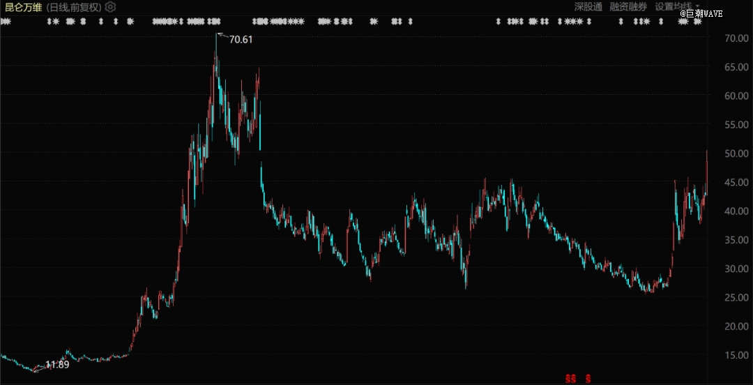 同樣在2023年大幅受益于AI概念的昆侖萬維,盡管當時并無特別亮眼的AI應(yīng)用落地,股價卻也在5月5日上漲到了歷史性高位70.61元/股。