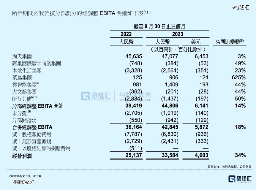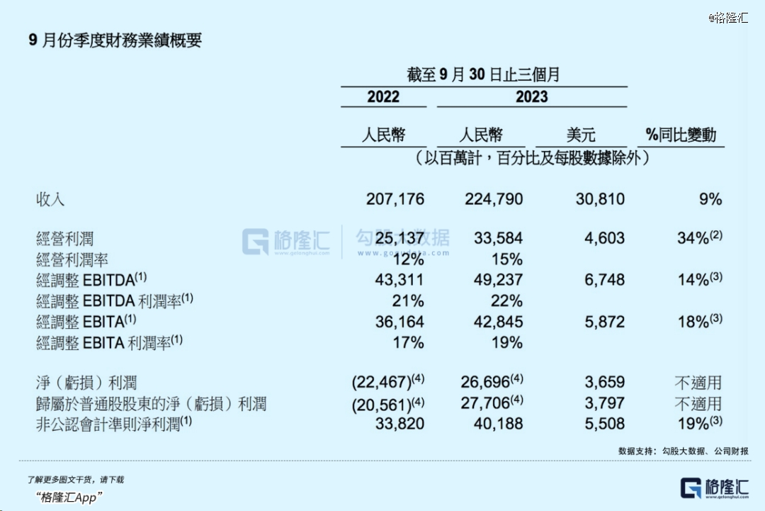 財報數(shù)據(jù)顯示,該季度實現(xiàn)營收2247.9億元人民幣,同比增長9%;經(jīng)營利潤335.84億元,同比增長34%;調(diào)整后EBITDA 492.4億元,同比增長14%;調(diào)整后凈利潤401.9億元,同比增長19%。