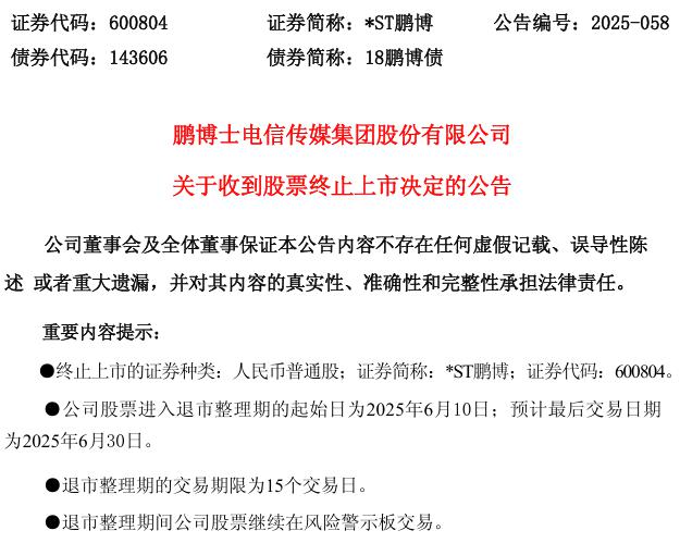 *ST鵬博(600804)公告稱,公司于2025年5月30日收到上海證券交易所出具的自律監(jiān)管決定書,決定終止公司股票上市。終止上市的證券種類為人民幣普通股,證券簡稱為*ST鵬博,證券代碼為600804。