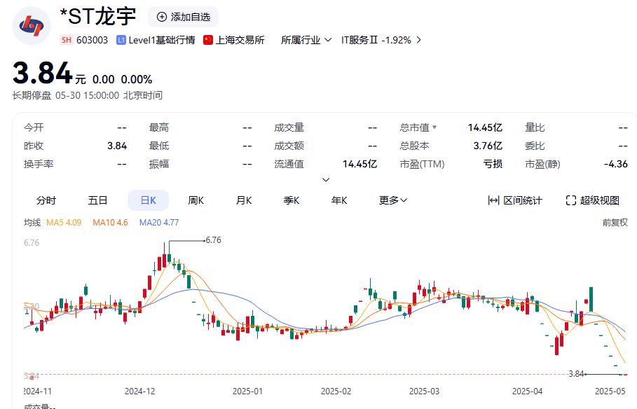 行情方面,*ST龍宇已于4月30日停牌,停牌前公司股價報3.84元/股。