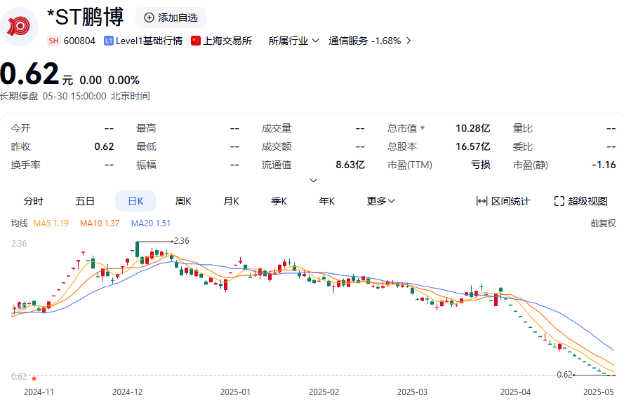 行情方面,*ST鵬博已于4月30日停牌,停牌前公司股價報0.62元/股。