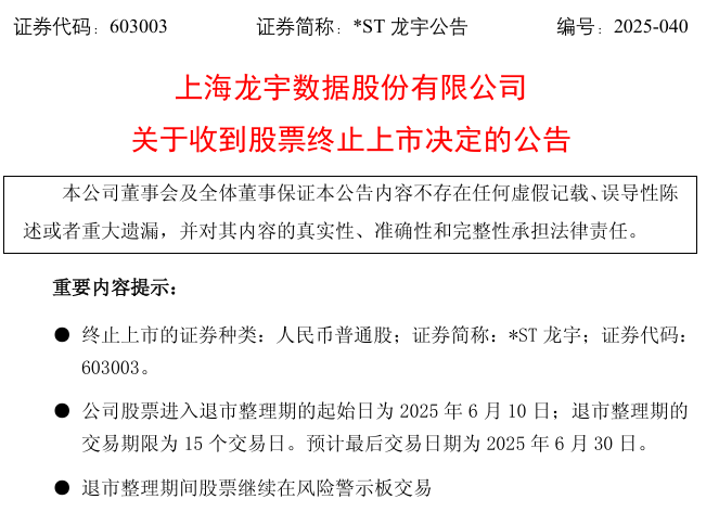 *ST龍宇(603003)也公告,公司于2025年5月30日收到上海證券交易所出具的自律監(jiān)管決定書,決定終止公司股票上市。終止上市的證券種類為人民幣普通股,證券簡稱為*ST龍宇,證券代碼為603003。