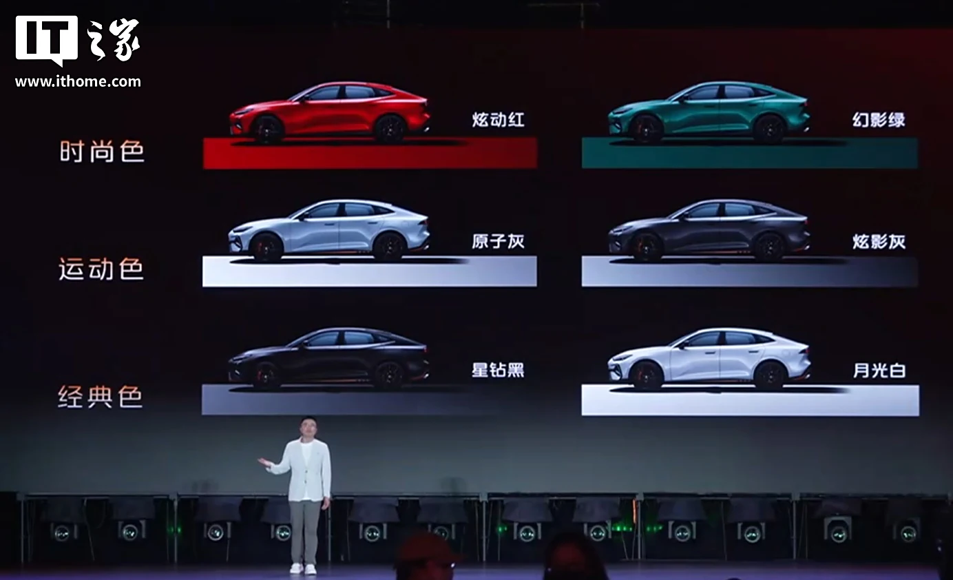 外觀方面,該車風阻系數(shù) 0.27Cd,基于“未來先鋒運動美學”設(shè)計語言打造,配合孟菲斯幾何切割造型的 LED 大燈組和暗影熏黑中網(wǎng),形成向前俯沖的視覺效果,可選 6 種外觀車色,以及懸浮車頂。