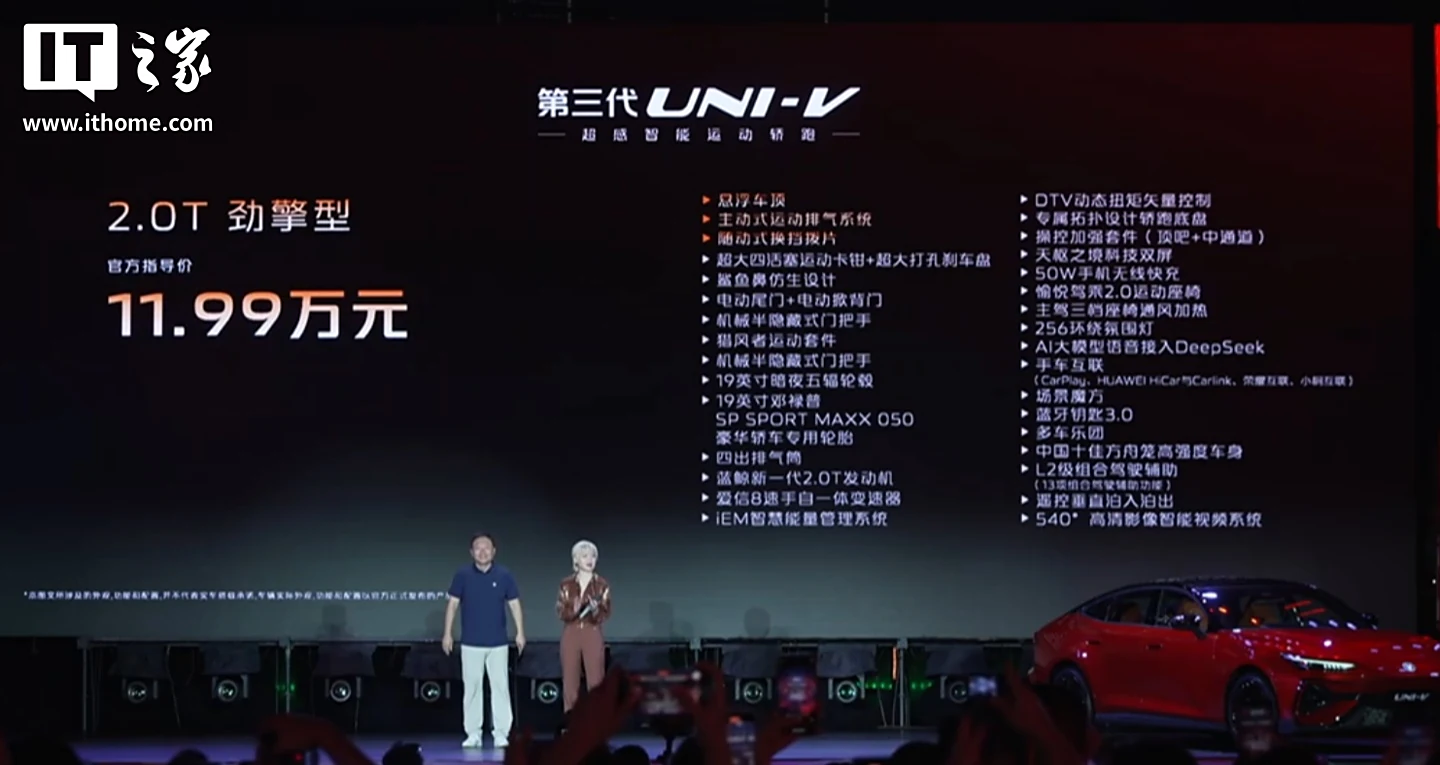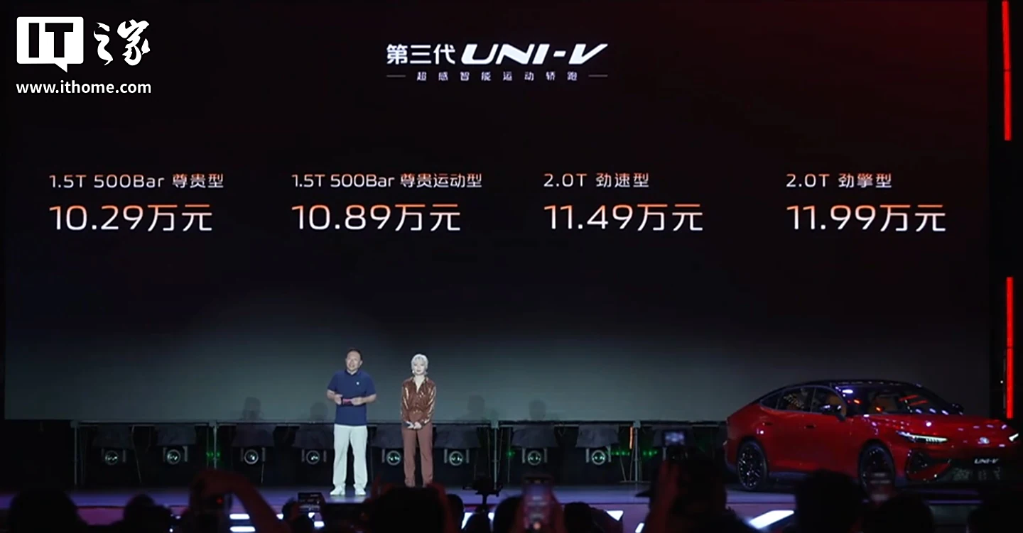 IT之家 8 月 7 日消息,長安汽車(000625)第三代 UNI-V 車型今晚正式上市,該車提供 1.5T 和 2.0T 兩種動力,售價 10.29 萬元起。