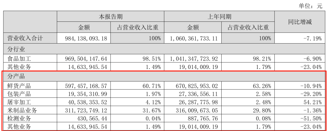 具體來看,煌上煌的主要產(chǎn)品營收近乎全線下滑,鮮貨產(chǎn)品、包裝產(chǎn)品、米制品業(yè)務(wù)分別同比減少10.94%、29.20%、1.36%,僅屠宰加工產(chǎn)品營收上升54.21%。