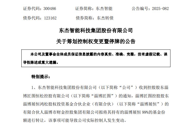 此前,東杰智能已于今年7月30日公告,淄博市財(cái)金控股集團(tuán)有限公司擬將其持有的淄博展恒99%的基金份額進(jìn)行轉(zhuǎn)讓?zhuān)撌马?xiàng)可能導(dǎo)致公司實(shí)際控制人發(fā)生變動(dòng)。但因事項(xiàng)處于籌劃階段,彼時(shí)并未申請(qǐng)停牌。