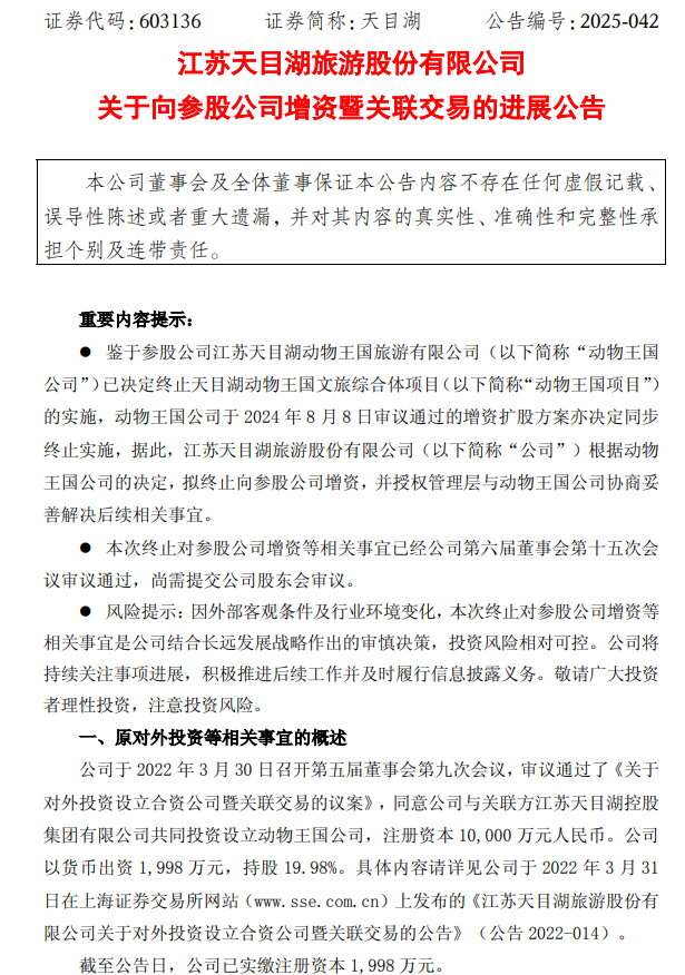 9月17日晚,A股上市公司天目湖發(fā)布公告稱,鑒于參股公司江蘇天目湖動物王國旅游有限公司(以下簡稱“動物王國公司”)已決定終止天目湖動物王國文旅綜合體項目(以下簡稱“動物王國項目”)的實施,動物王國公司于2024年8月8日審議通過的增資擴股方案亦決定同步終止實施,據(jù)此,江蘇天目湖旅游股份有限公司(以下簡稱“公司”)根據(jù)動物王國公司的決定,擬終止向參股公司增資,并授權管理層與動物王國公司協(xié)商妥善解決后續(xù)相關事宜。
