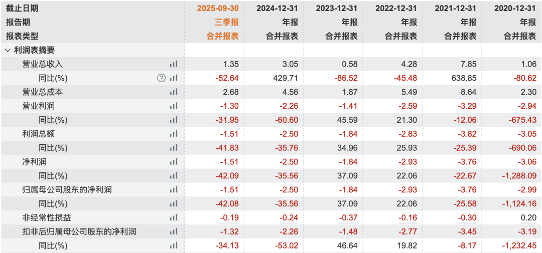 盡管股價(jià)大幅上漲,但ST中迪的經(jīng)營狀況依然嚴(yán)峻。根據(jù)公司披露的財(cái)務(wù)數(shù)據(jù),2025年前三季度,該公司營業(yè)收入為1.35億元,同比下降52.64%;利潤總額為-1.51億元,同比下降41.83%。更為嚴(yán)峻的是,ST中迪2022年度、2023年度、2024年度三個(gè)會(huì)計(jì)年度扣除非經(jīng)常性損益前后凈利潤孰低者均為負(fù)值,且2024年度審計(jì)報(bào)告顯示公司持續(xù)經(jīng)營能力存在重大不確定性。這導(dǎo)致公司股票被繼續(xù)實(shí)施其他風(fēng)險(xiǎn)警示。