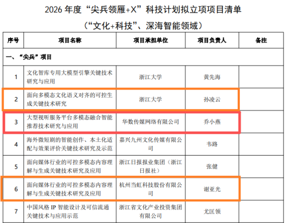 近日,浙江省科技廳發(fā)布了2026年度“尖兵領(lǐng)雁+X”科技計(jì)劃擬立項(xiàng)項(xiàng)目清單(“文化+科技”、深海智能領(lǐng)域)。其中由華數(shù)傳媒(000156)網(wǎng)絡(luò)有限公司首次牽頭承擔(dān)的“大型視聽服務(wù)平臺(tái)多模態(tài)融合智能推薦技術(shù)研究與應(yīng)用”成功入選“尖兵”項(xiàng)目清單。同時(shí),華數(shù)作為重要參與單位的2個(gè)“尖兵”項(xiàng)目也成功入選,分別是“面向多模態(tài)文化語義對(duì)齊的可控生成關(guān)鍵技術(shù)研究”和“面向媒體行業(yè)的可控多模態(tài)內(nèi)容理解與生成關(guān)鍵技術(shù)研究及應(yīng)用”。