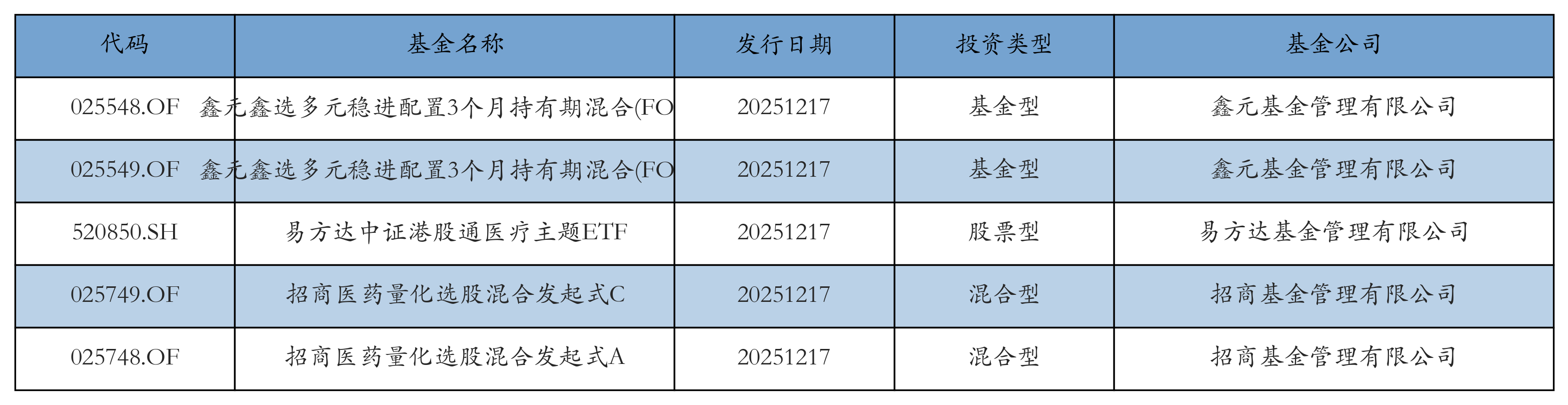 昨日有5只新基金發(fā)行,分別為:鑫元鑫選多元穩(wěn)進(jìn)配置3個(gè)月持有期混合(FOF)A、鑫元鑫選多元穩(wěn)進(jìn)配置3個(gè)月持有期混合(FOF)C、易方達(dá)中證港股通醫(yī)療主題ETF、招商醫(yī)藥量化選股混合發(fā)起式C、招商醫(yī)藥量化選股混合發(fā)起式A,詳情見(jiàn)下表:
